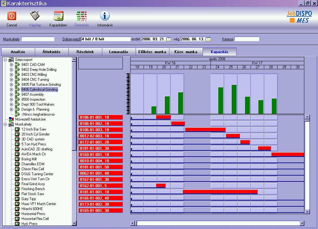 A JobDISPO BKN a termelés stratégiai elemzését teszi lehetővé. Folyamatábrák és termelési jellemzők grafikonjai szemléltetik az egyedi erőforrások vagy erőforrás-csoportok aktuális terhelési adatait.